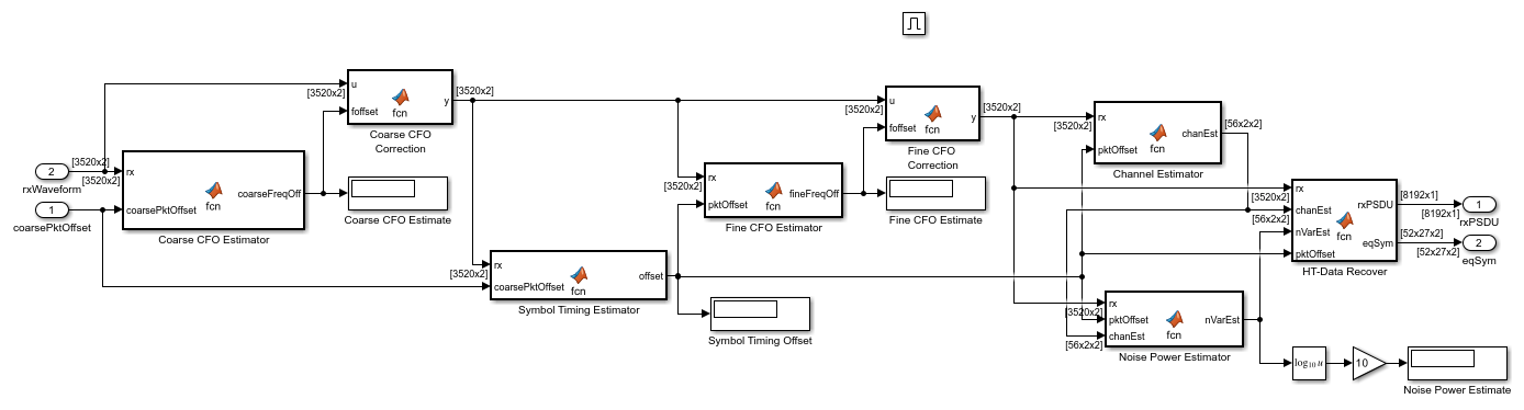 The MATLAB Function block allows MATLAB® functions to be used in a Simulink model. In this example an 802.11n link is modeled in Simulink by using MATLAB Function blocks to call WLAN Toolbox functions. For an equivalent 802.11n simulation in MATLAB see the example 802.11n Packet Error Rate Simulation for 2x2 TGn Channel.