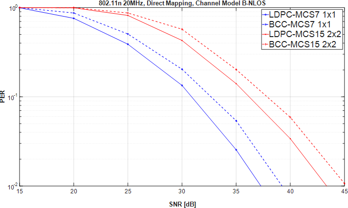 title('802.11n 20MHz, MCS15, Direct Mapping, 2x2 Channel Model B-NLOS');
