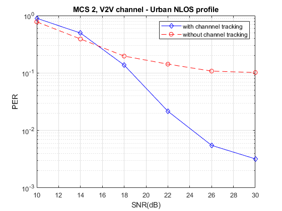This example shows how to measure the packet error rate (PER) of an IEEE® 802.11p™ link using an end-to-end simulation with a Vehicle-to-Vehicle (V2V) fading channel and additive white Gaussian noise. The PER performance of a receiver with and without channel tracking is compared. In a vehicular environment (high Doppler), a receiver with channel tracking performs better.