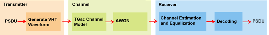 This example shows you how to create a simple transmitter-channel-receiver simulation using WLAN Toolbox. The example implements a VHT transmit and receive link by transmitting a VHT packet through a TGac channel then demodulating and equalizing the symbols. Finally, the example decodes the equalized symbols to recover the transmitted bits. These processing steps are shown in this diagram.