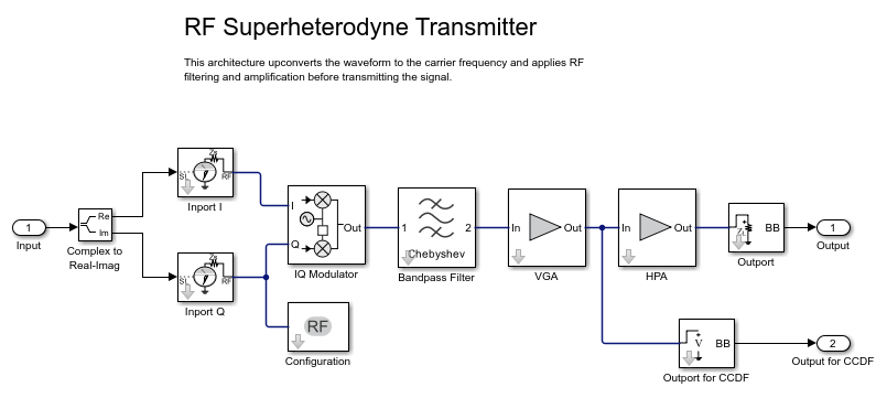 Model the effects of upconverting the waveform to the carrier frequency by using the RF Transmitter Subsystem block. This block models the impairments introduced by an RF transmitter using RF Blockset blocks.