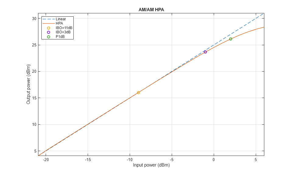 Nonlinear HPA (IBO = 3 dB). To operate at an IBO level of 3 dB, set the Available power gain parameter of the VGA block to 13 dB.