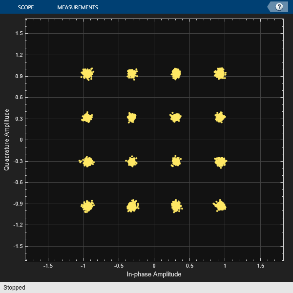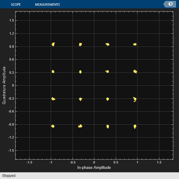 Linear HPA (IBO = 11 dB). To operate at an IBO level of 11 dB, set the Available power gain parameter of the VGA block to 5 dB. To calculate the EVM and plot the constellation diagram, run the simulation to capture one packet (Stop Time equal to 304.4 us for the default configuration).