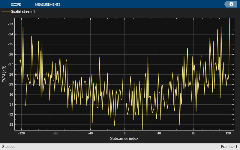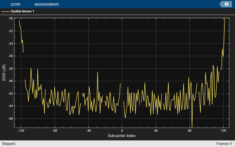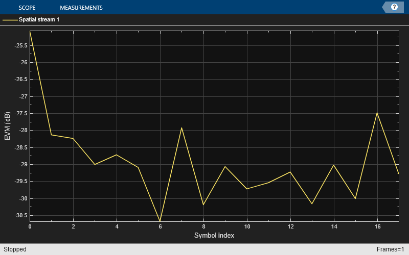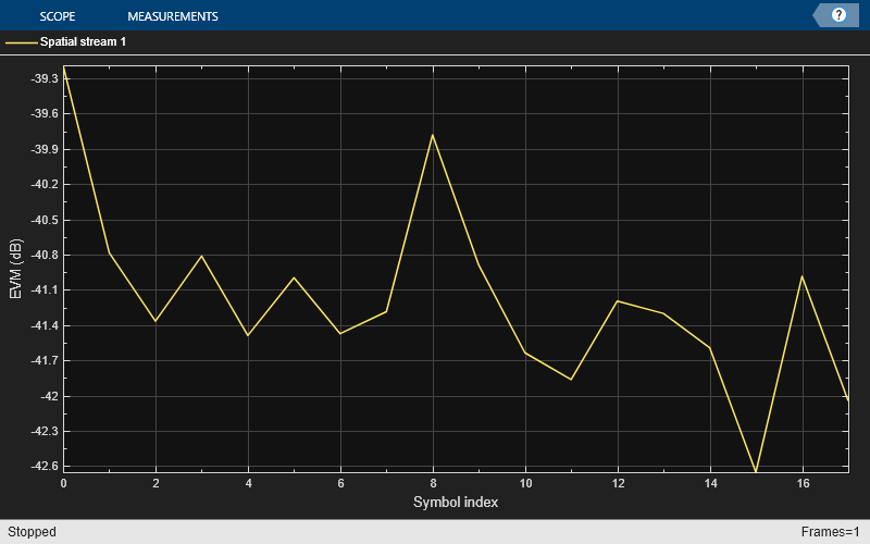 The Demodulation and EVM calculation block recovers and plots the HE Data symbols in the Constellation Diagram block by performing frequency and packet offset corrections, channel estimation, pilot phase tracking, OFDM demodulation, and equalization. This block also performs these EVM measurements: