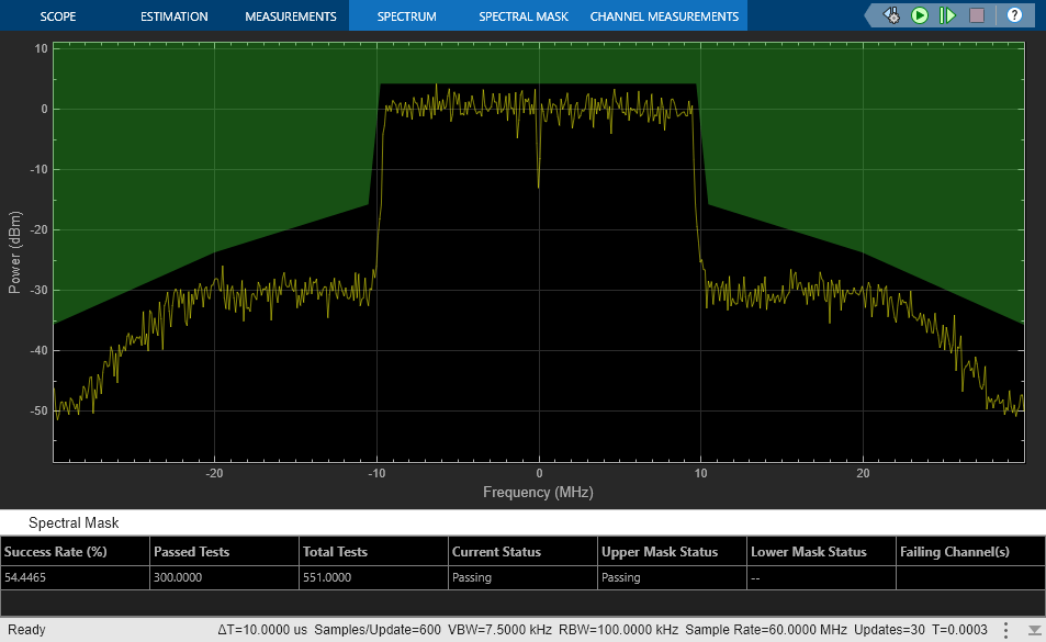 Calculate the occupied bandwidth and channel power and depict the spectral mask by using the Spectrum Analyzer block.
