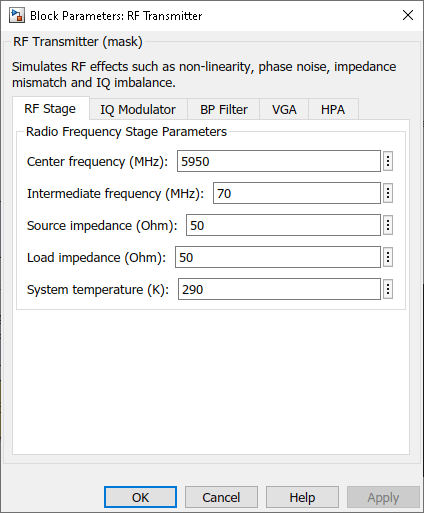 You can configure the RF Transmitter components by using the RF Transmitter Subsystem block mask.
