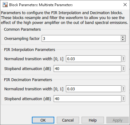 To display the effect of the high-power amplifier (HPA) on the out-of-band spectral emissions, the FIR Interpolation block oversamples and filters the waveform. At the output of the RF Transmitter Subsystem block, the FIR Decimation block downsamples the waveform back to its original sampling rate. The Multirate Parameters block provides an interface to configure the parameters of the FIR Interpolation and Decimation blocks.