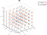 Live Script showing an example of a vector valued function w in 3D space (x, y, and z coordinates) evaluated as a quiver plot. The curl of w is also a vector field with direction towards the counter-clockwise-rotating w flow, following the right-hand rule.