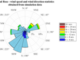 The present code is a Matlab function that allows a Wind Rose diagram (i.e., a direction-intensity histogram) to be plotted based on empirical or simulation data for wind direction (in cardinals or degrees) and wind speed (in m/s) using 16 spatial directions (N, NNE, NE, ENE, E, …, NNW) and 7 speed levels (0 to 4 m/s, 4 to 8 m/s, …, 24+ m/s). The plot can be used for meteorology purposes and gives a concise view of how wind speed and direction are distributed at a particular location.