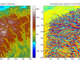 Solarradiation.m is used to calculate the solar radiation for a digital elevation model integrated over one year. Radiation is calculated depending on latitude, elevation, horizon shading, slope, aspect, time of year and hour of the day (day length/season) and ground reflectance.