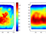 The left plot is a pcolor (shading interp, axis equal) of a "jagged" 906x1024 matrix. Note that the edges have NaN values (white coloring). On the right, pcolor of output of smooth2a, with Nr = Nc = 50. NaN's are preserved, but do not affect the smoothing of adjacent elements.