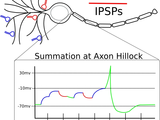 An inhibitory postsynaptic potentials (IPSP) is a temporary hyperpolarization of postsynaptic membrane caused by the flow of negatively charged ions into the postsynaptic cell. An IPSP is received when an inhibitory presynaptic cell, connected to the dendrite, fires an action potential. The IPSP signal is propagated down the dendrite and is summed with other inputs at the axon hilllock. The IPSP decreases the neurons membrane potential and makes more unlikely for an action potential to occur. A postsynaptic cell typically has less inhibitory connections but the connections are closer to the soma. The proximity of the inhibitory connections produces a stronger signal such that fewer IPSPs are needed to cancel out the effect of EPSPs.