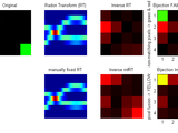 1st-row L-to-R: Shows an original image GREEN, then its MATLAB's radon transform (a.k.a. sinogram), then its MATLAB's inverse radon transform REED (aka iradon), then the position comparison between the original and reconstructed, NON-MATCHING pixel position: SEPARATE COLORS.