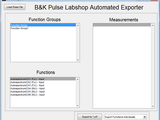 This GUI runs Pulse Labshop in the backround (not visible) through an activex server. Exporting measurements using B&K Pulse's software is extremely tedious, requiring much mouse-clicking (setting measurement marks, following measurement marks, etc.). This GUI is relatively straightforward - select your .pls file(s), type in the function name you wish to export along with its correpsonding function group, and list all of the measurement names you wish to export. Each function is exported to a single file within a folder that is created of the same name as the .pls file.