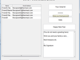 This app allows you to import your contacts' names and email addresses from a text or CSV-file. You can customize the greeting, subject and email body based on the occasion.