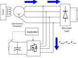 It senses deviation in speed, then calculates power to be dumped(Pdump). Then, it senses load current and voltage from which p and q is calculated(pq theory). Then oscillating part of p (say p1) is found using digital filter. To compensates reactive power and mitigate current harmonics, p1 and q should be injected. To regulate speed, Pdump should be drawn. So, net power p1-Pdump is to be injected along with q. With this value, current to be injected is calculated. This reference current is fed to hysteresis band current controller which generates gate signal for inverter. Inverter injects the current.