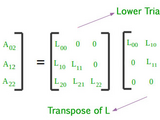 This is an implementation of Cholesky decomposition based on [1]. The algorithm exploits matrix multiplication and is consequently faster than the canonical implementations of Cholesky decomposition via Cholesky-Banachiewicz/Cholesky-Crout decompositions, which use only matrix-vector multiplication (and not matrix-matrix multiplication). Interestingly enough, the algorithm can be seen as a hybrid between Cholesky-Banachiewicz and Cholesky-Crout algorithms. The algorithm takes a parameter, which says how large should be the matrix for matrix multiplication. If no parameter is passed, an optimal size for matrix multiplication is estimated.