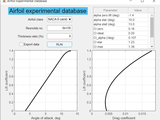 This app queries an aerodynamic database of NACA 4 digits, 5 digits, 6 series, and NASA supercritical airfoils. Data for the NACA sections has been derived from the book Theory of Wing Sections, by Abbott and Von Doenhoff. Data for NASA supercritical (cambered) airfoil is extracted from NASA TM 81912. The app reports airfoil characteristics, lift curve and drag polar with a few inputs. The user has only to select airfoil family and assign relative thickness and Reynolds number. The characteristics of the curves are reported in a table, which can be exported on a spreadsheet file. All data are at low Mach number, incompressible flow regime. Very useful in preliminary aircraft design, when the user needs a reliable source of data but has only few global parameters to play with.