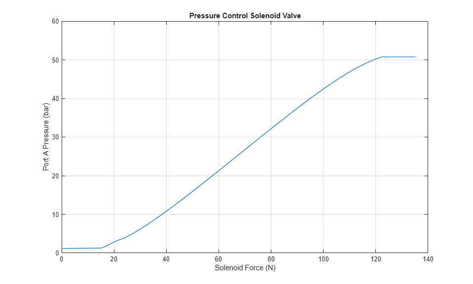 This example shows how to model, parameterize, and test a pressure control solenoid valve. This example also generates a plot of the relationship between applied solenoid force and the resulting actuator port pressure.