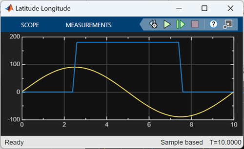 Simulate the model and observe the latitude (in yellow) and longitude (in blue) position history of the trajectory.