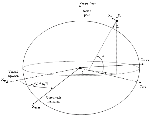 The origin of the ECEF coordinate frame is the center of the Earth. The body of interest is assumed to be rigid, an assumption that eliminates the need to consider the forces acting between individual elements of mass. The representation of the rotation of ECEF frame from ECI frame is simplified to consider only the constant rotation of the ellipsoid Earth (ωe) including an initial celestial longitude (LG(0)). This excellent approximation allows the forces due to the Earth complex motion relative to the fixed stars to be neglected.