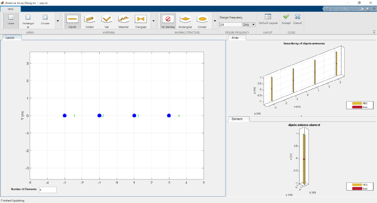 Select Dipole from Antenna Gallery. Select No Backing under the Backing Structure Gallery. Specify the design frequency as 2.4 GHz. In Layout pane, specify the Number of Elements as 4 and click Accept under the Close section.