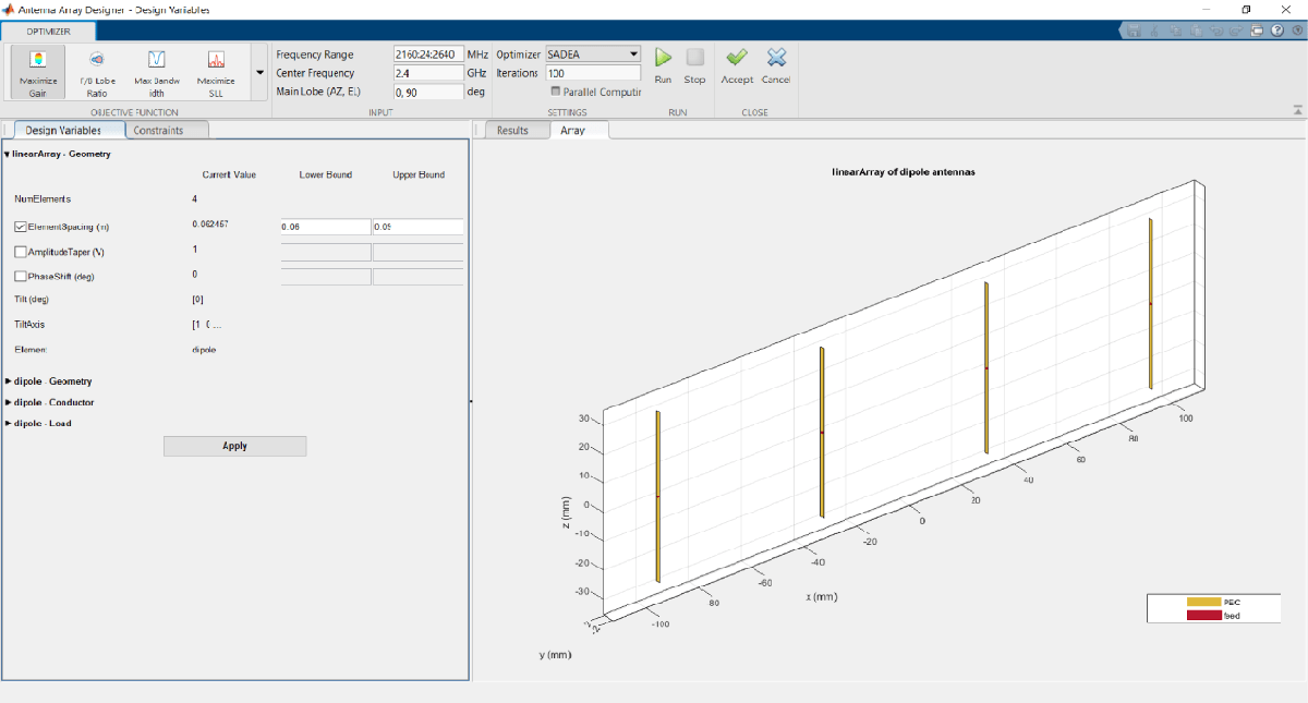 Optimize arrays for various analysis results under given constraints using SADEA, Surrogate, or TR-SADEA optimization methods.