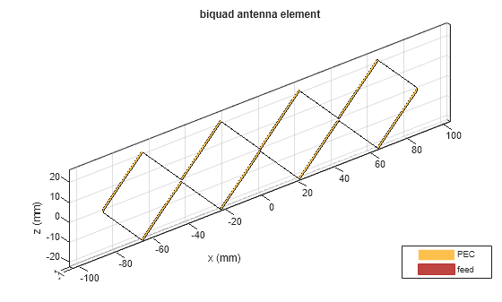 b = biquad creates a biquad antenna with default property values. The default dimensions are chosen for an operating frequency of around 2.74 GHz.