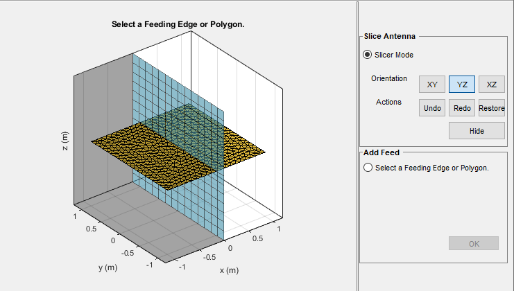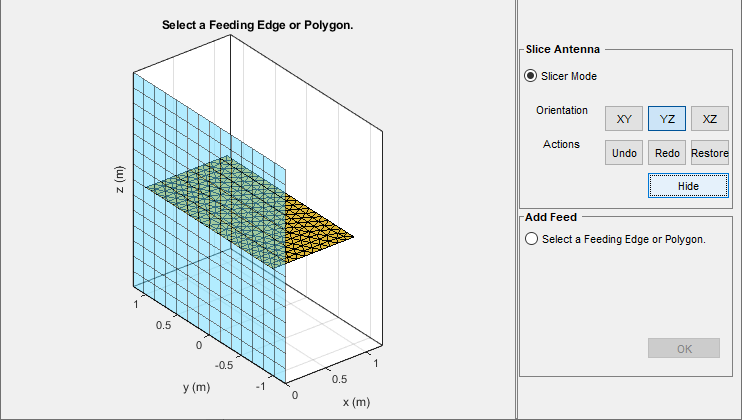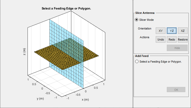 The UI figure window consists of two panes, Slice Antenna and the Add Feed pane. Select the Slicer Mode, then click YZ to select that as the plane along which to slice your antenna.