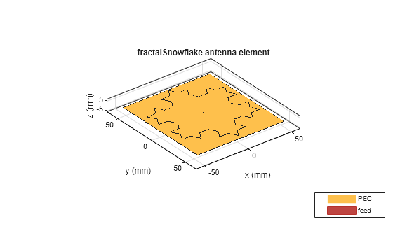 ant = fractalSnowflake creates a Koch’s snowflake fractal antenna with default property values. The default fractal is centered at the origin, and the number of iterations is set to 2. The default dimensions are chosen for an operating frequency of around 4.12 GHz.