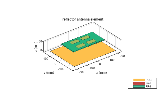 Figure contains an axes object. The axes object with title reflector antenna element, xlabel x (mm), ylabel y (mm) contains 4 objects of type patch, surface. These objects represent PEC, feed, FR4.