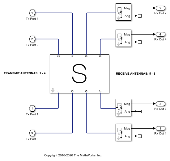 The transmit side comprises of a 4 element linear array of resonant dipoles spaced half-wavelength apart. There are 4 receiving antennas, resonant dipoles, placed in the far-field of this array. These 4 dipoles are placed in the azimuthal plane at 15 degrees, 45 degrees, 315 degrees and 345 degrees. The locations correspond to the expected beam peaks from the switched beam array output. The response at each of these far-field receiving antenna elements is computed as a superposition of the contributions from each antenna element in the 4-element transmit array. The channel is assumed to be free-space. To capture the interactions on the transmit side and the transfer function from the transmit to receive antennas, we compute the overall scattering parameters for the transmit-receive system. This is done by using the conformalArray in Antenna Toolbox. The resulting 8-port S-parameter matrix is loaded into the S-parameters block in RF Blockset. The first 4 ports correspond to the transmit side antenna elements and the ports 5-8 belong to the individual receiving antennas in the far-field.