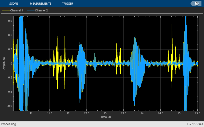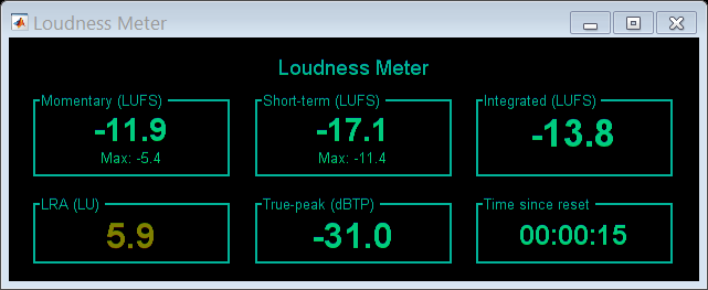 scope = timescope('SampleRate',sampleRate, ... 'TimeSpanSource','property', ... 'TimeSpanOverrunAction','scroll', ... 'TimeSpan',5, ... 'BufferLength',5*2*sampleRate, ... 'YLimits',[-1 1]); loudMtr = loudnessMeter('SampleRate',sampleRate); visualize(loudMtr) while ~isDone(fileReader) audioIn = fileReader(); controlSignal = osc(); setParameter(hostedPlugin,1,controlSignal(1)); stereoAudioIn = [audioIn,audioIn]; x = process(hostedPlugin,stereoAudioIn); loudMtr(x); scope([x(:,1),audioIn(:,1)]) deviceWriter(x); end