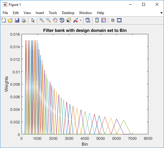 'Bin'–– The bandedge frequencies in'Hz'are converted to bins. The filter bank triangles are drawn symmetrically in bins.Change the