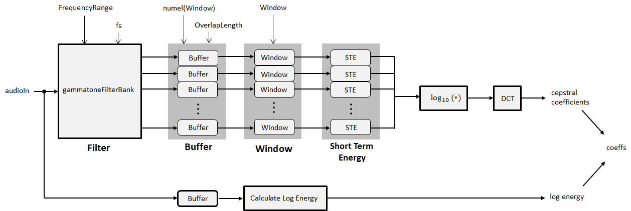 gtcc(audioIn,fs, ... NumCoeffs=20, ... FrequencyRange=[62.5,12000], ... Window=hann(round(0.05*fs),"periodic"), ... OverlapLength=round(0.025*fs), ... LogEnergy="replace", ... FilterDomain="time")