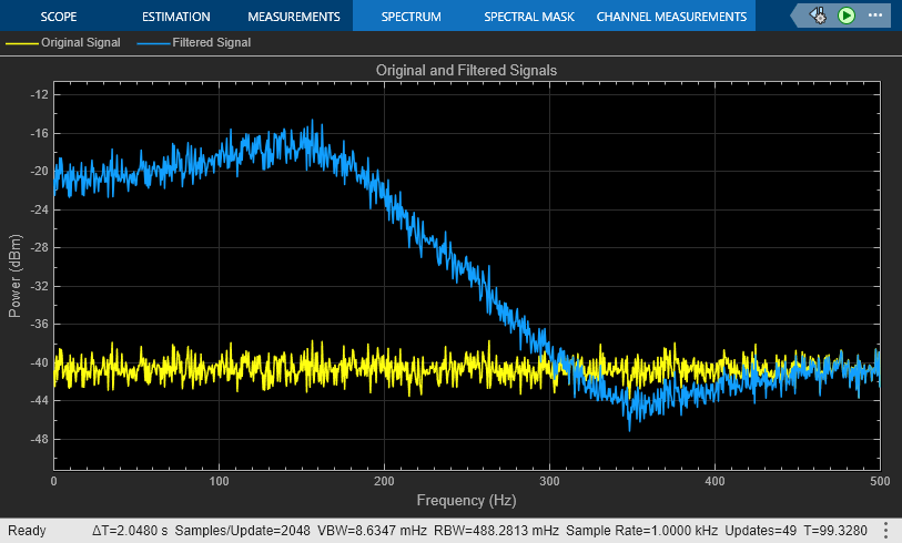 Use the Shelving Equalizer Design block to design a shelving equalizer and pass the coefficients to a Second-Order Section Filter block to filter a signal of random noise. Tune the filter parameters using the dashboard controls and see how the spectrum of the filtered signal changes.