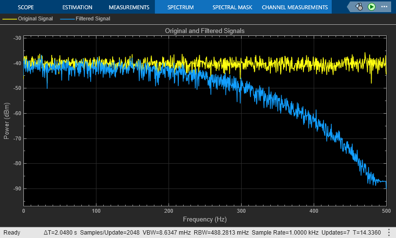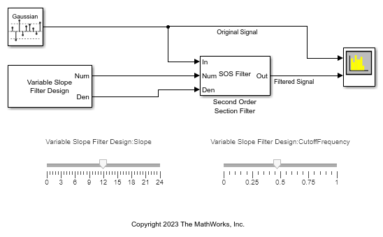 Use the Variable Slope Filter Design block to design a lowpass filter and pass the coefficients to a Second-Order Section Filter block to filter a signal of random noise. Tune the filter parameters using the dashboard controls and see how the spectrum of the filtered signal changes.