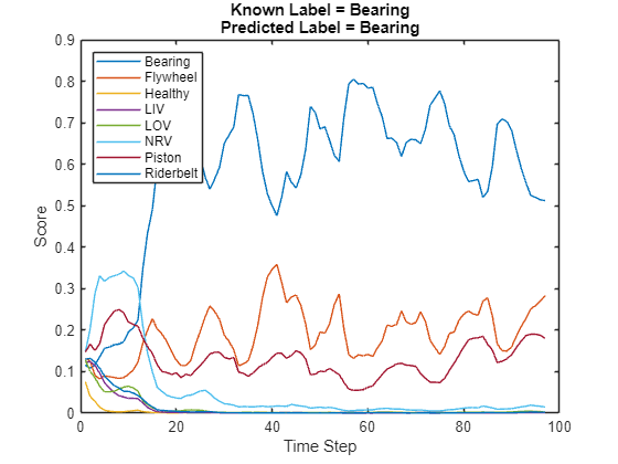 reset(adsValidation) N = 10; labels = categories(labelsValidation); numLabels = numel(labels); % Create a dsp.AsyncBuffer to read audio in a streaming fashion audioSource = dsp.AsyncBuffer; % Create a dsp.AsyncBuffer to accumulate scores scoreBuffer = dsp.AsyncBuffer; % Create a dsp.AsyncBuffer to record execution time. timingBuffer = dsp.AsyncBuffer; % Pre-allocate array to store results streamingResults = categorical(zeros(N,1)); % Loop over files for fileIdx = 1:N % Read one audio file and put it in the source buffer [data,dataInfo] = read(adsValidation); write(audioSource,data); % Inner loop over frames rs = true; while audioSource.NumUnreadSamples >= windowLength % Get a frame of audio data x = read(audioSource,windowLength); % Apply streaming classifier function tic score = recognizeAirCompressorFault(x,rs); write(timingBuffer,toc); % Store score for analysis write(scoreBuffer,extractdata(score)'); rs = false; end reset(audioSource) % Store class result for that file scores = read(scoreBuffer); result = scores2label(scores(end,:),uniqueLabels,2); streamingResults(fileIdx) = result; % Plot scores to compare over time figure plot(scores) %#ok<*NASGU> legend(uniqueLabels,Location="northwest") xlabel("Time Step") ylabel("Score") title(["Known Label = " + string(labelsValidation(fileIdx)),"Predicted Label = " + string(streamingResults(fileIdx))]) end