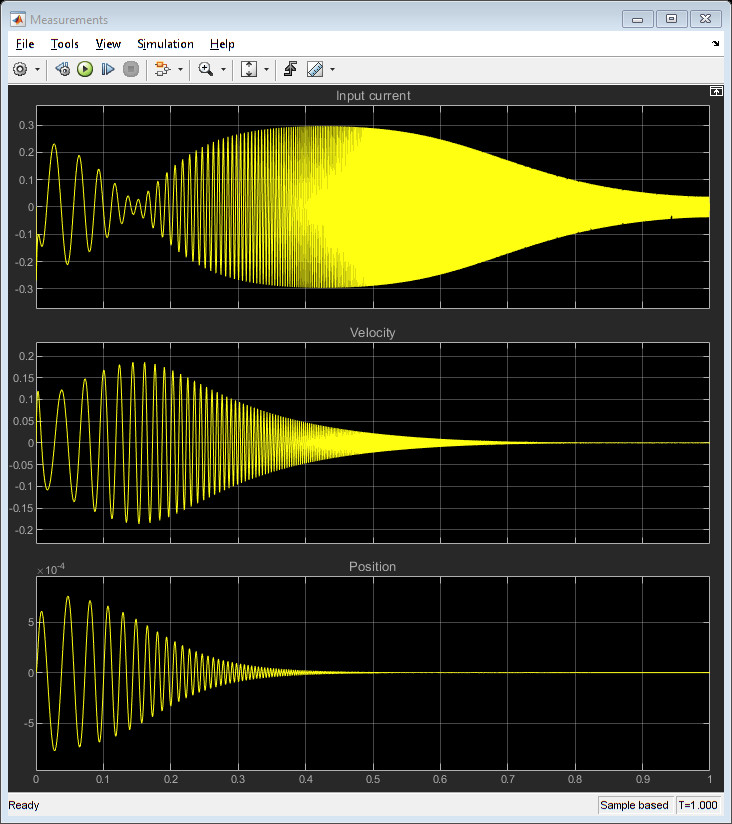 Simscape™ also allows mixing electrical and mechanical elements, so the loudspeaker model can be simulated without any physical domain conversions. Again, the same results are obtained.