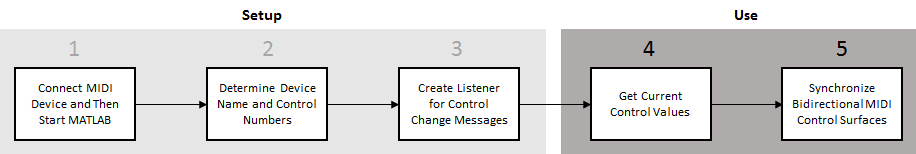This diagram shows a typical workflow involving general MIDI functions in MATLAB. For the Simulink environment, follow steps 1 and 2, and then use the MIDI Controls block for a user-interface guided workflow.