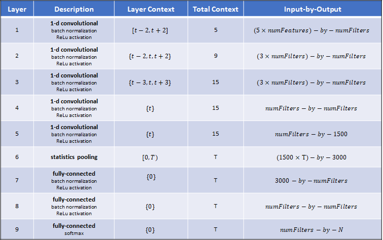 numFilters =512; dropProb = 0.2; classes = unique(labelsTrain); numClasses = numel(classes); layers = [ sequenceInputLayer(afe.FeatureVectorLength,MinLength=15,Name="input") convolution1dLayer(5,numFilters,DilationFactor=1,Name="conv_1") batchNormalizationLayer(Name="BN_1") dropoutLayer(dropProb,Name="drop_1") reluLayer(Name="act_1") convolution1dLayer(3,numFilters,DilationFactor=2,Name="conv_2") batchNormalizationLayer(Name="BN_2") dropoutLayer(dropProb,Name="drop_2") reluLayer(Name="act_2") convolution1dLayer(3,numFilters,DilationFactor=3,Name="conv_3") batchNormalizationLayer(Name="BN_3") dropoutLayer(dropProb,Name="drop_3") reluLayer(Name="act_3") convolution1dLayer(1,numFilters,DilationFactor=1,Name="conv_4") batchNormalizationLayer(Name="BN_4") dropoutLayer(dropProb,Name="drop_4") reluLayer(Name="act_4") convolution1dLayer(1,1500,DilationFactor=1,Name="conv_5") batchNormalizationLayer(Name="BN_5") dropoutLayer(dropProb,Name="drop_5") reluLayer(Name="act_5") statisticsPooling1dLayer(Name="statistics_pooling") fullyConnectedLayer(numFilters,Name="fc_1") batchNormalizationLayer(Name="BN_6") dropoutLayer(dropProb,Name="drop_6") reluLayer(Name="act_6") fullyConnectedLayer(numFilters,Name="fc_2") batchNormalizationLayer(Name="BN_7") dropoutLayer(dropProb,Name="drop_7") reluLayer(Name="act_7") fullyConnectedLayer(numClasses,Name="fc_3") softmaxLayer(Name="softmax") ];