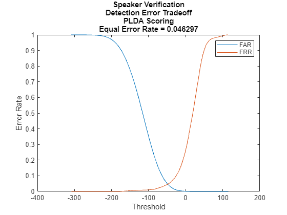 figure plot(detTable.PLDA.Threshold,detTable.PLDA.FAR, ... detTable.PLDA.Threshold,detTable.PLDA.FRR) eer = helperEqualErrorRate(detTable.PLDA); title(["Speaker Verification","Detection Error Tradeoff","PLDA Scoring","Equal Error Rate = " + eer]); xlabel("Threshold") ylabel("Error Rate") legend(["FAR","FRR"])
