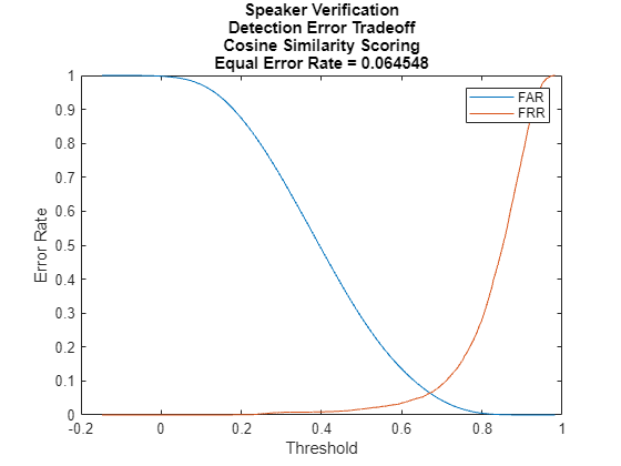figure plot(detTable.CSS.Threshold,detTable.CSS.FAR, ... detTable.CSS.Threshold,detTable.CSS.FRR) eer = helperEqualErrorRate(detTable.CSS); title(["Speaker Verification","Detection Error Tradeoff","Cosine Similarity Scoring","Equal Error Rate = " + eer]); xlabel("Threshold") ylabel("Error Rate") legend(["FAR","FRR"])