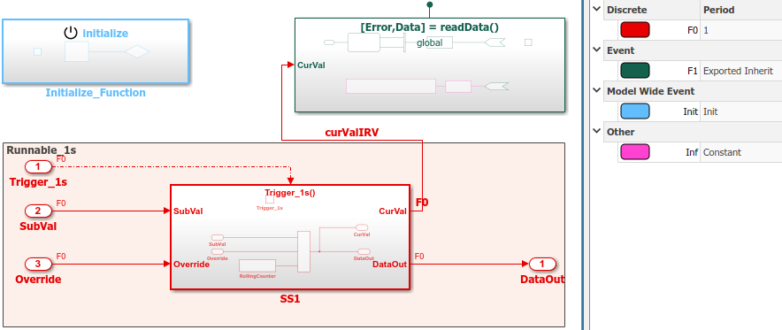 In the model window, enable sample time color-coding by selecting the Debug tab and selecting Diagnostics > Information Overlays > Colors. The sample time legend shows the implicit rate grouping. Red identifies the discrete rate. Green identifies rates inherited from exported functions, indicating their execution is outside the context of Simulink scheduling.