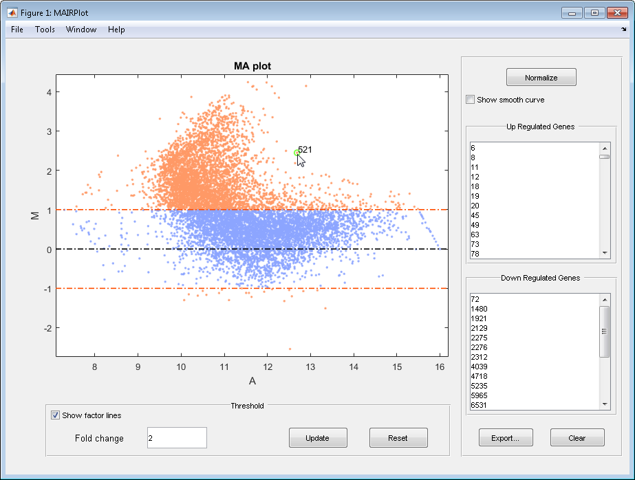 View lists of significantly up-regulated and down-regulated genes, and optionally, export the gene labels and indices to a structure in the MATLAB® Workspace by clicking Export.