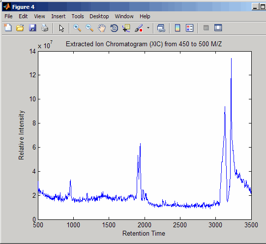 figure [MZ,Y] = msppresample(ms_peaks,5000,'Range',[450 500]); plot(ret_time,sum(Y)) title('Extracted Ion Chromatogram (XIC) from 450 to 500 M/Z') xlabel('Retention Time') ylabel('Relative Intensity')