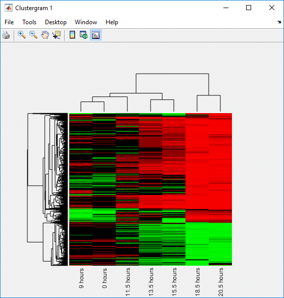 Clustergramruns creating three MATLAB variables (data,Genes, andTimeSteps) and displaying a Clustergram window containing dendrograms and a heat map of the data.