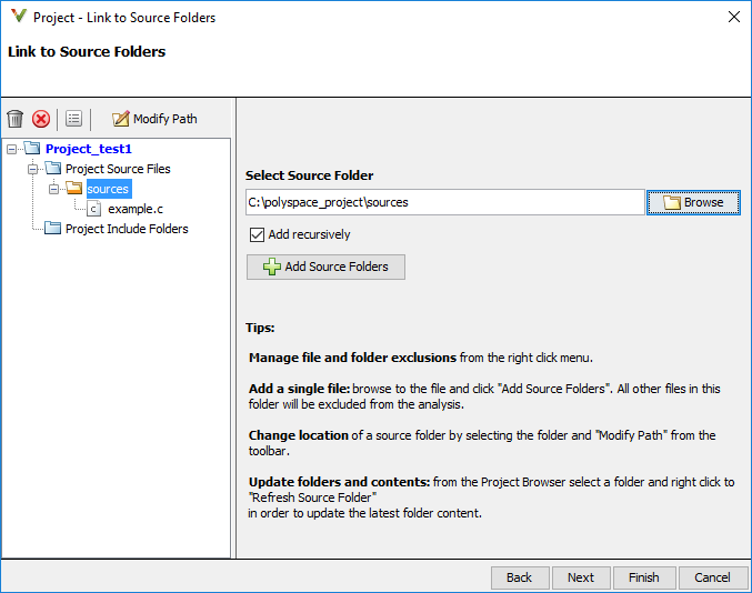 After providing a project name and location, on the next window, enter or navigate to the root folder containing your source files. After selecting the Add recursively box, click Add Source Folders. All files in the folder and subfolders are added to your project. To exclude specific files or folders from analysis, right-click the files or folders and select Exclude Files.