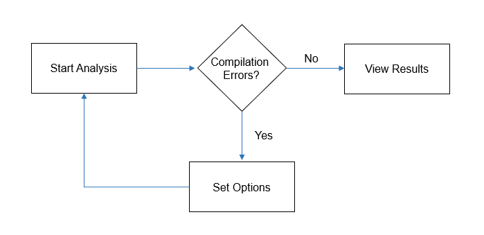After you specify your source files and compiler, start the Polyspace analysis. During analysis, Polyspace first compiles your code, and then checks for bugs (Bug Finder) or proves code correctness (Code Prover). If you encounter compilation errors, read the error message and diagnose the root cause of the error. To resolve the errors, you often have to set some Polyspace configuration options and rerun the analysis.