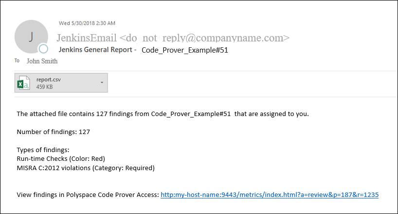 If you use the Polyspace plugin in Jenkins, you can use Polyspace helper utilities for the entire e-mail notification process. See Sample Scripts for Polyspace Analysis with Jenkins